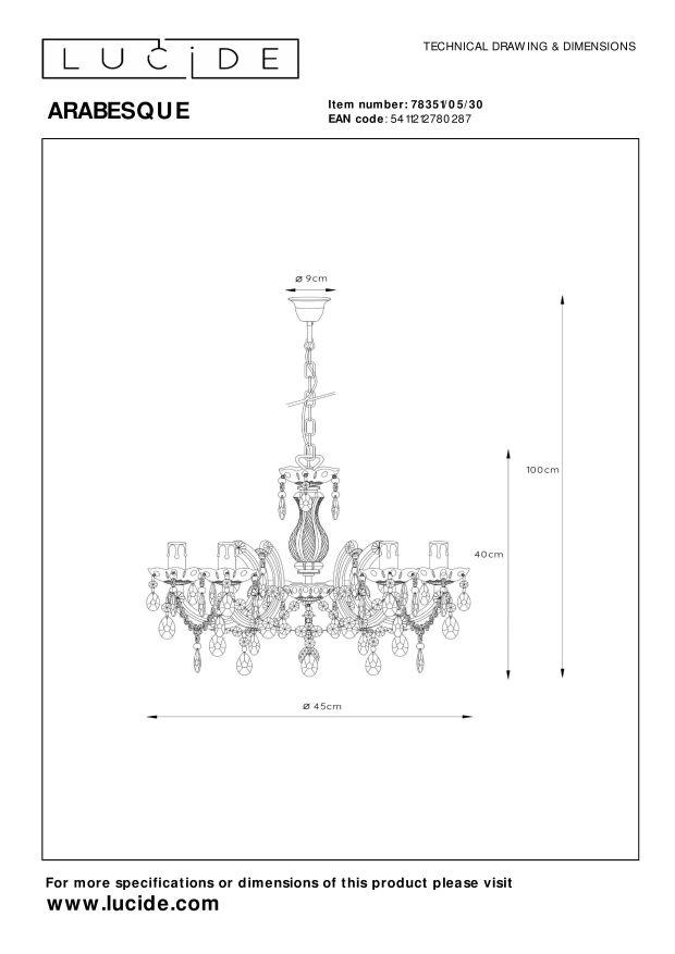 Arabesque iz Lucide je eleganten lestenec s čudovitim zaključkom. Primeren za vsak prostor in na voljo v različnih elegantnih barvah, črni ali prozorni, na voljo pa je tudi v večbarvnih za šik, a nekoliko bolj lahkomiselno vzdušje. Arabesque ima največjo višino 100 cm in premer 48 cm ter ima pet priključkov E14.
