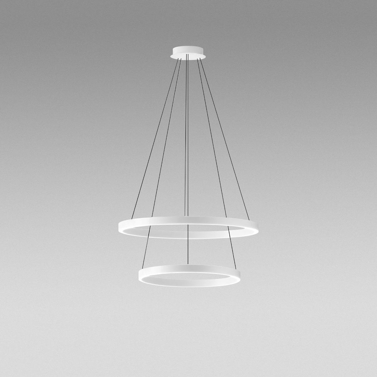 Belo satenirano aluminijasto ogrodje. Bel opalni silikonski difuzor. Dvoemisijski svetlobni vir LED z možnostjo zatemnitve s faznim izrezom prek zunanjega zatemnilnika + potiska (ni priložen).