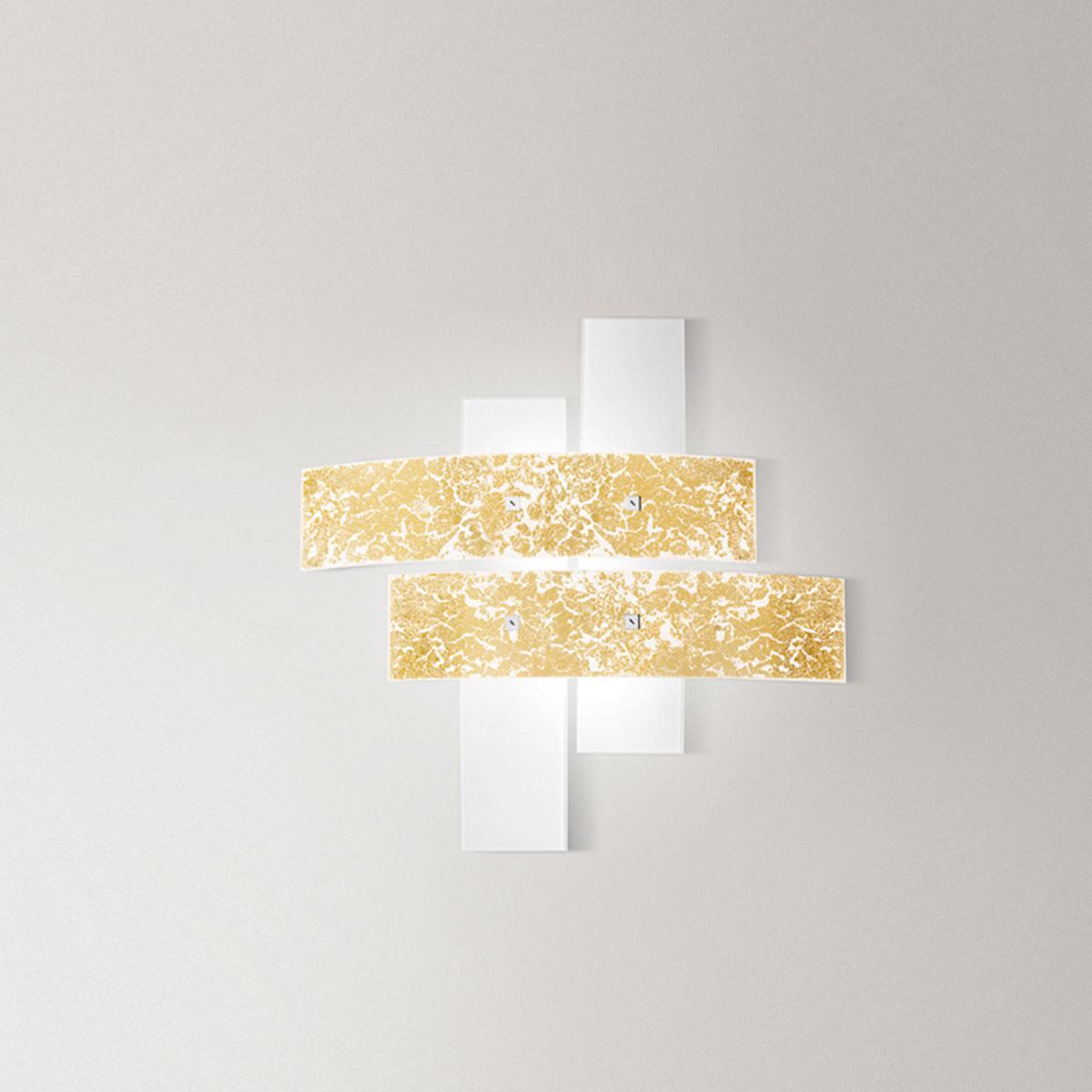 Kovinski okov s kromiranim zaključkom. Belo steklo s steklom v barvi zlatih lističev. Poljski zaključek. Žarnica ni priložena.