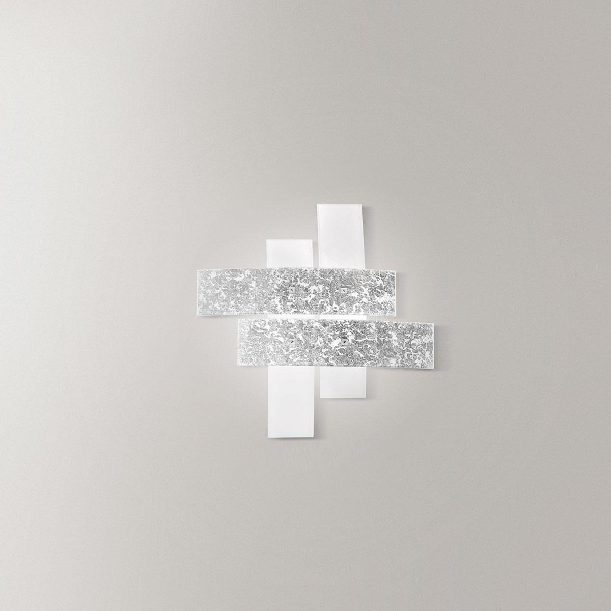 Kovinski okov s kromiranim zaključkom. Belo steklo s steklom v barvi srebrnih listov. Poljski zaključek. Žarnica ni priložena.