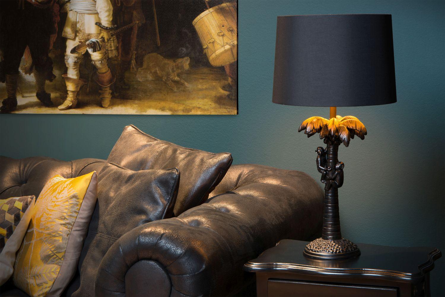 Kombinirati funkcionalno namizno svetilko z igrivim, ekstravagantnim poudarkom v notranjosti? Extravaganza Coconut naredi to namesto vas. Eksotičen prizor se odvija pod senčnikom klasičnega videza Bombaž. Dva šimpanza splezata na palmo. Ena vneto nabira kokosove orehe, medtem ko druga, manjša opica, odobravajoče opazuje. Krošnjo drevesa dodatno osvetljuje svetilka, ki razpršeno širi svojo svetlobo. Plastična svetilka je visoka pol metra in je kompatibilna z LED žarnico. Luč enostavno prižigaš in ugašaš s stikalom na vrvici. Uživajte v spektaklu in novi privlačnosti v vaši notranjosti.