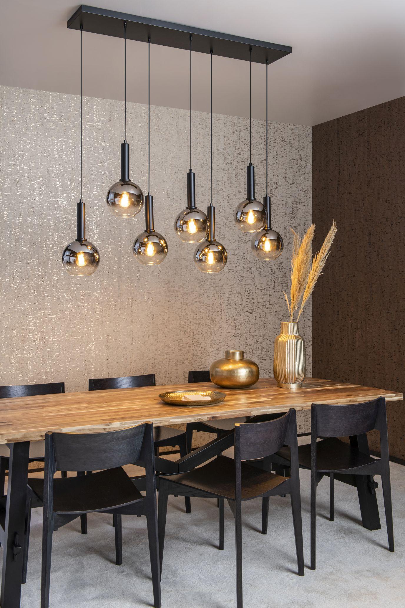 Sferični stekleni senčniki na Mariusu vam in vašim sostanovalcem delajo družbo v stilu. Ta sodobna viseča svetilka združuje visokokakovostne materiale, kot sta elegantno dimno steklo in kovina, da ustvari precejšnjo privlačnost. In to je mogoče razumeti dobesedno. Dolžina tega lestenca je 130 centimetrov, višina pa je nastavljiva od 70 do 150 centimetrov. Povežite Mariusovih 7 svetlobnih virov z zatemnilnikom in poskrbite, da se bodo vsi počutili kot doma, kadar koli v dnevu.
